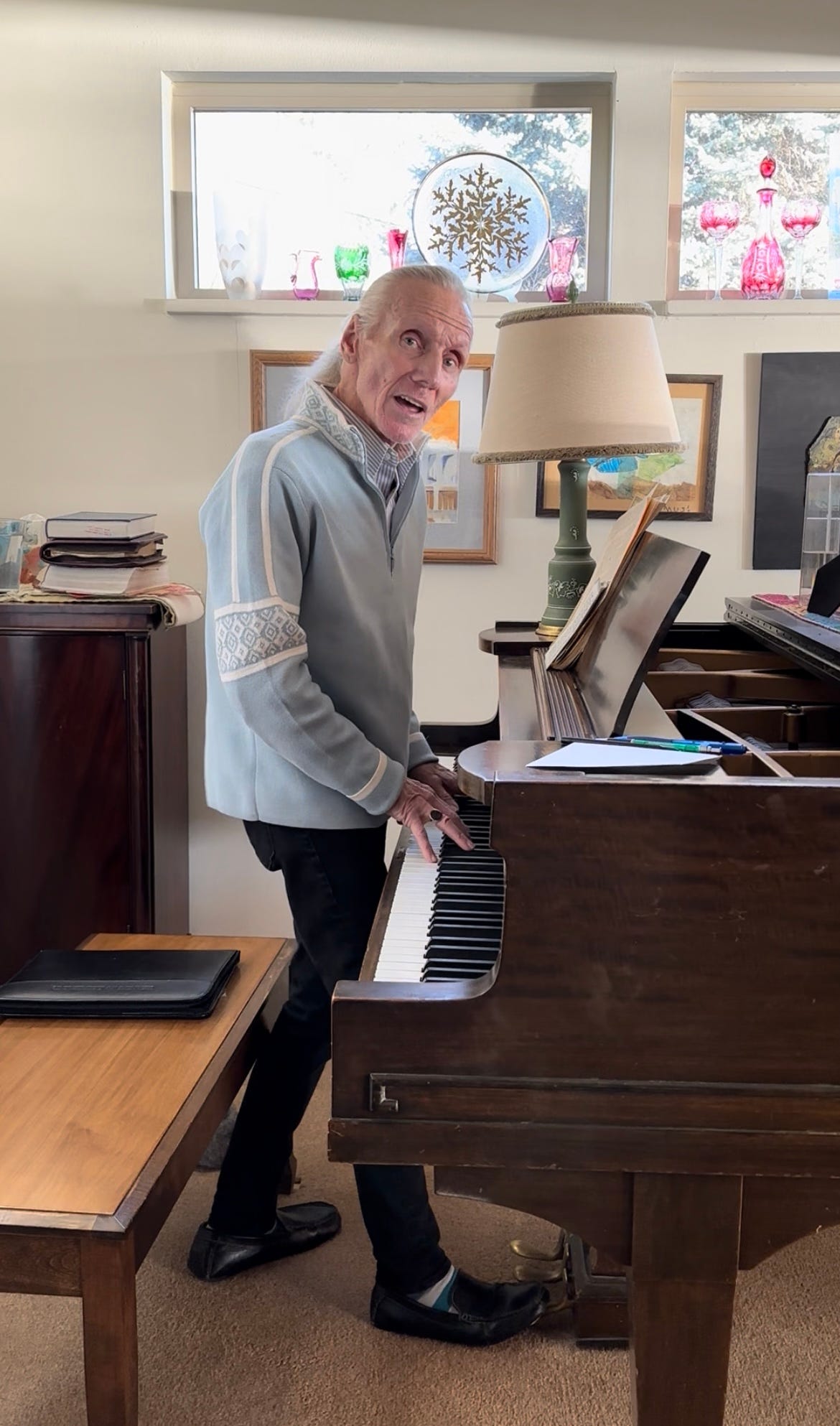 He’d sit up there at the front, on stage left, pounding away at his piano; he’d wave his hands stern in front of the Christmas Eve choir, which often was just a handful of elderly people, my grandparents included, holding their warbling harmonies. His eyebrows always knit in concentration, his small body gave itself over in wholeness to whatever he was playing and singing.